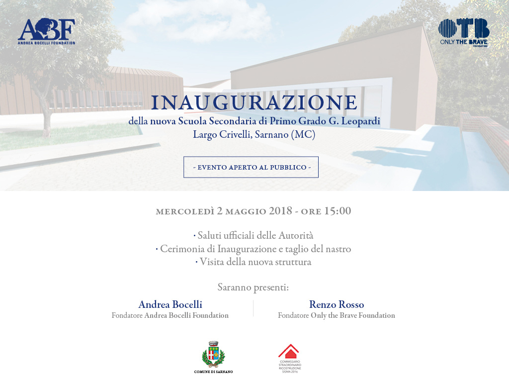The event will take place in the front courtyard of the school, at the presence of the children, their families, the entire community, as well as the workers, the donors and the partners who contributed to the realization of the project. After the Welcome speech by Mayor Franco Ceregioli and Special Commissioner for the Reconstruction Paola De Micheli, Renzo Rosso and Andrea Bocelli will address the public. Maestro Bocelli -together with the local music band and the students – will sing the Italian National Anthem to celebrate the ribbon cutting.