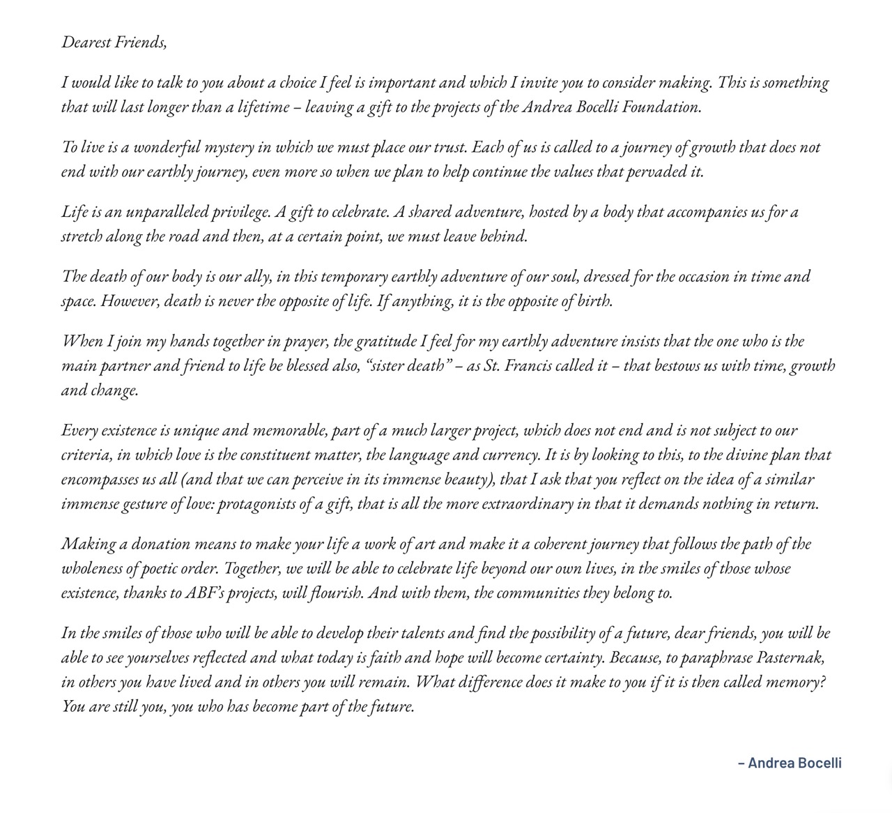 A bequest to the Andrea Bocelli Foundation will nurture talents and bring education, healthcare and hope to entire communities in Italy and around the world. It is a choice that honors your memory and ensures that your commitment to a future of opportunity and beauty lasts forever.