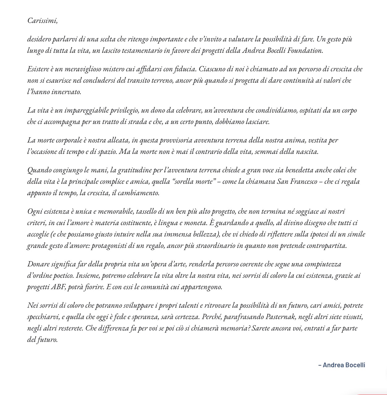 La polizza vita non fa parte dell’eredità, quindi puoi nominare liberamente Andrea Bocelli Foundation come beneficiario, senza vincoli verso gli eredi.